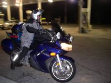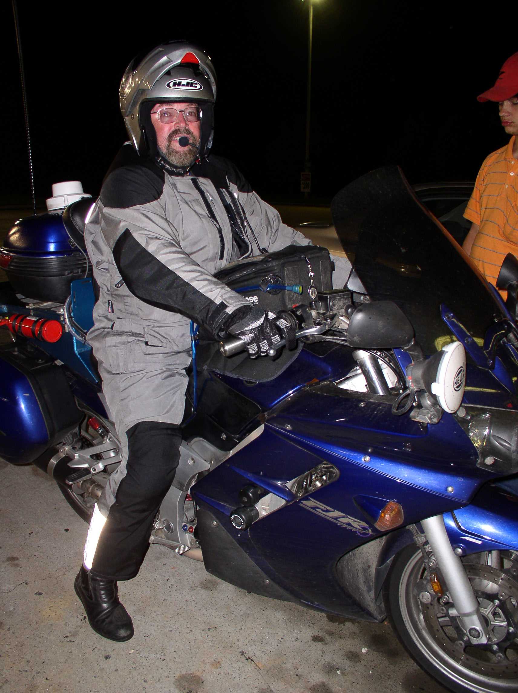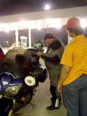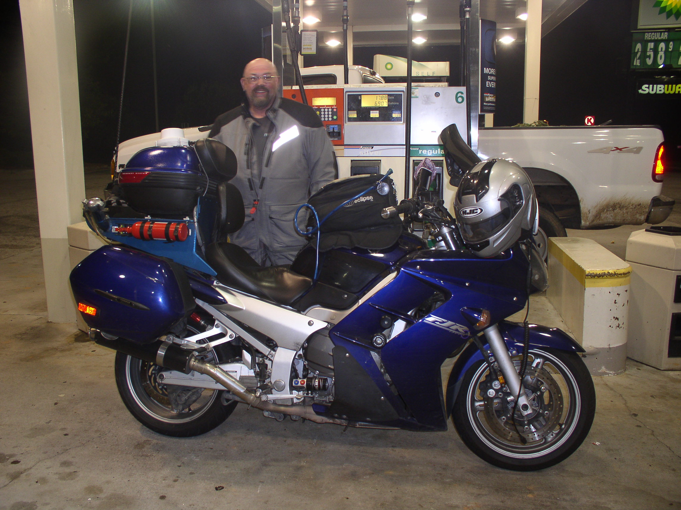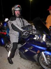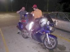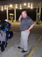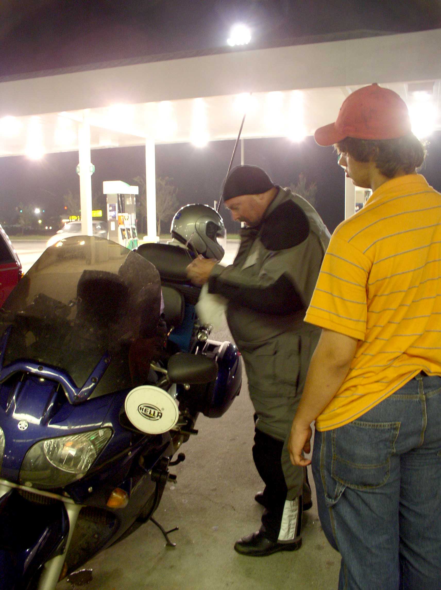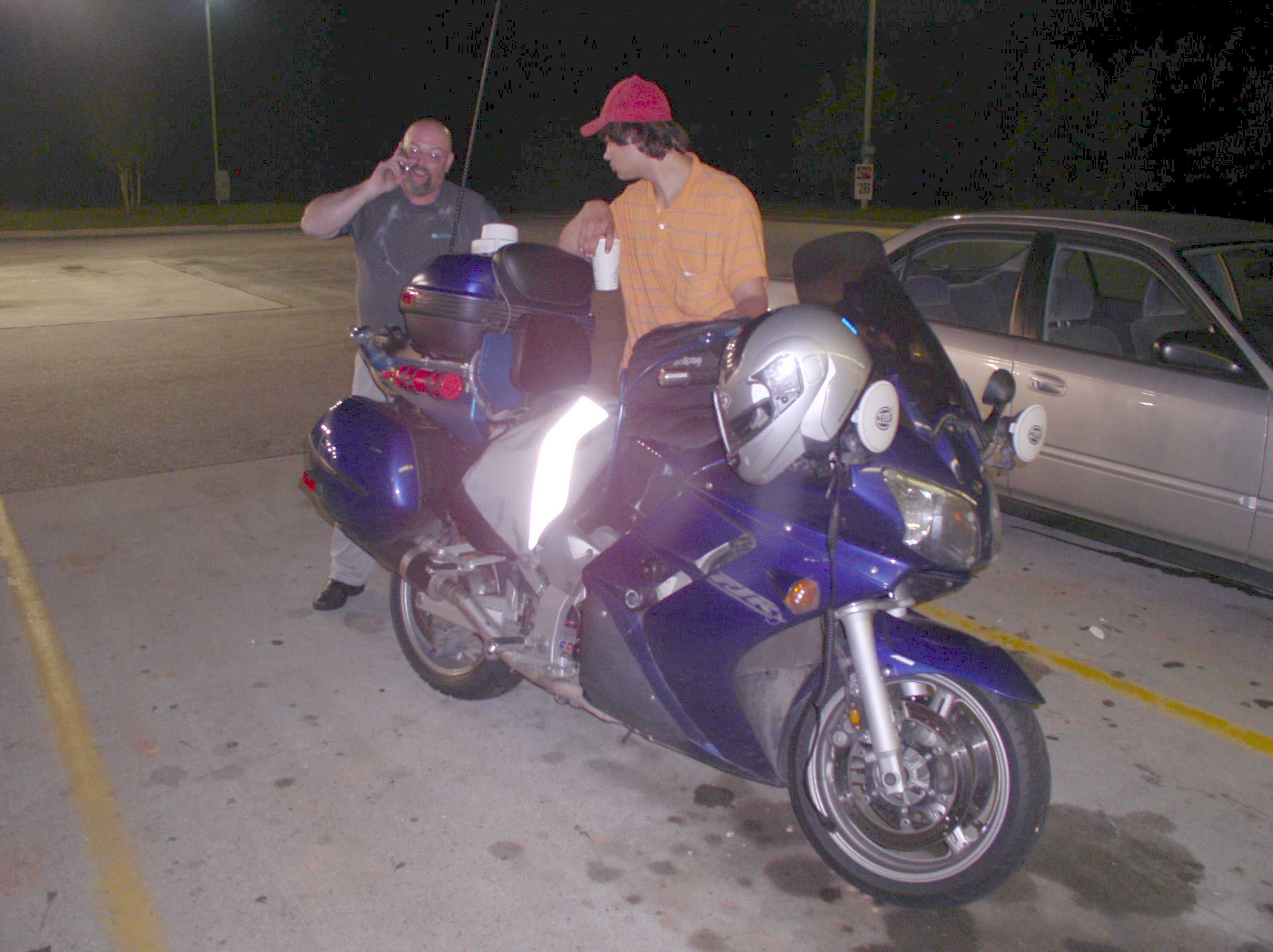 August 24, 2005) The IronButt Rally this year is using transponders on selected bikes to allow tracking via the internet. When I read that a Sabmaggot, Doug Chapman, was riding in the IBR, and that he had a link on his website (www.dougc.com) to the Star-Traxx system showing his locations (Current and past), I started following him on the web. Then this afternoon the IBA Newsletter gave a link (http://rally.star-traxx.com/rallyview.asp?Rally=30) allowing the tracking of all 13 bikes with transponders. I noticed that two bikes had gone to Key West by way of Fontana Dam, and the route from Fontana to Key West took them within a few miles of where I live (Sautee, Georgia). I also noticed Doug was heading back north, presumably on the way to Denver. Sabmaggot Steve Ripaldi suggested he would probably go for the Fontana Dam bonus, which meant it was likely he would be riding within a few miles of me. Hmmmmmm. I wonder, .... maybe I can wait by the side of the highway, catch him when he goes by, and ride along. I pondered this out loud (onlist) and Ripaldi suggested putting a sign up beside the highway. Great idea! I went right to work, made a sign saying "GO DOUG" and also made a smaller sign with the SabMag logo on it. While I was doing this, I was also tracking Doug's progress, trying to estimate when he would pass near me. Realizing it would be dark when he went by on Hwy 365 (my best guess ETA was 8:55 pm), I decided rather than going to the nearest point on 365 (no street lights), I would head south a ways and set up at an intersection that had a traffic light and gas stations on two corners. I knew it would be well lit, and Doug would be more likely to see the signs. I briefly considered taking the bike, thinking a Magna on the side of the road would catch his eye, but the signs were too unwieldy, so I decide to take the cage instead. Timing was becoming critical. If I waited at home and watched the website to be sure he turned northeast at Atlanta, I might not be able to get to my proposed intercept point before he did. So I threw everything in the car and headed that way, but got on the phone with Ken Carter, who I know from the TwoWheelsOnly list. He kept tabs on Doug's location while I drove. It looked like I was going to be cutting it very close, with his ETA being 8:55 and my ETA at the intercept point being 8:45. I started looking for a motorcycle heading the opposite direction. Just as I neared the intercept point, I saw a bike go by. I did a u-turn at the light and started to chase him down. Before I got close, I saw the bike turn off at a side road, and then knew it couldn't be Doug. Another u-turn and I'm speeding back to the "intercept" corner. The light favors me as a get there, so I make a U-turn again so I can pull into the BP station, park the car, dash down to the roadside with the signs, and get them set up before Doug comes by. As I whipped into the BP parking lot, I noticed a bike at the pumps. Could it be? Yes! Sure enough, it's Doug, gassing up. I'm laughing my head off as I pull up beside him and hang the "GO DOUG" sign out the window. Doug was a little nonplused. He spilled some gas, then forgot to tell the machine he wanted the receipt. I parked, got out and took a photo and we started chatting. He later said that when I pulled up next to him, in the middle of nowhere, and hung the sign "GO DOUG" out of my window, he felt like he was in the Twilight Zone or something. He also told me that it wasn't a planned fuel stop, but he had been riding with his visor up, and some prehistoric sized bug had clobbered him in the face. After riding several miles with one eye closed, trying to get bug guts off his face and glasses, he decided it was a good time to get fuel. And there we were. He was planning on getting a sandwich at the Subway anyway, so we had a chance to visit. It was a little difficult because we were immediately latched on to by this kid named Jonathan, who seemed a few bricks shy of a load. But he was very curious and followed us everywhere, asking questions all the time. Doug's doing well. He's on track for 25000 points for this leg, he said. That's a good number. He's heading to Robbinsville where we will get to sleep in a motel, because Fontana Dam doesn't open until 9 am, and he needs to get inside in order to get the bonus points. After that, he's heading back to Denver, the first checkpoint. After a leisurely hour long break, it was time to suit up and head back out on the Iron Butt Trail. Below are a few photos from our encounter. Good luck, Doug. |