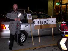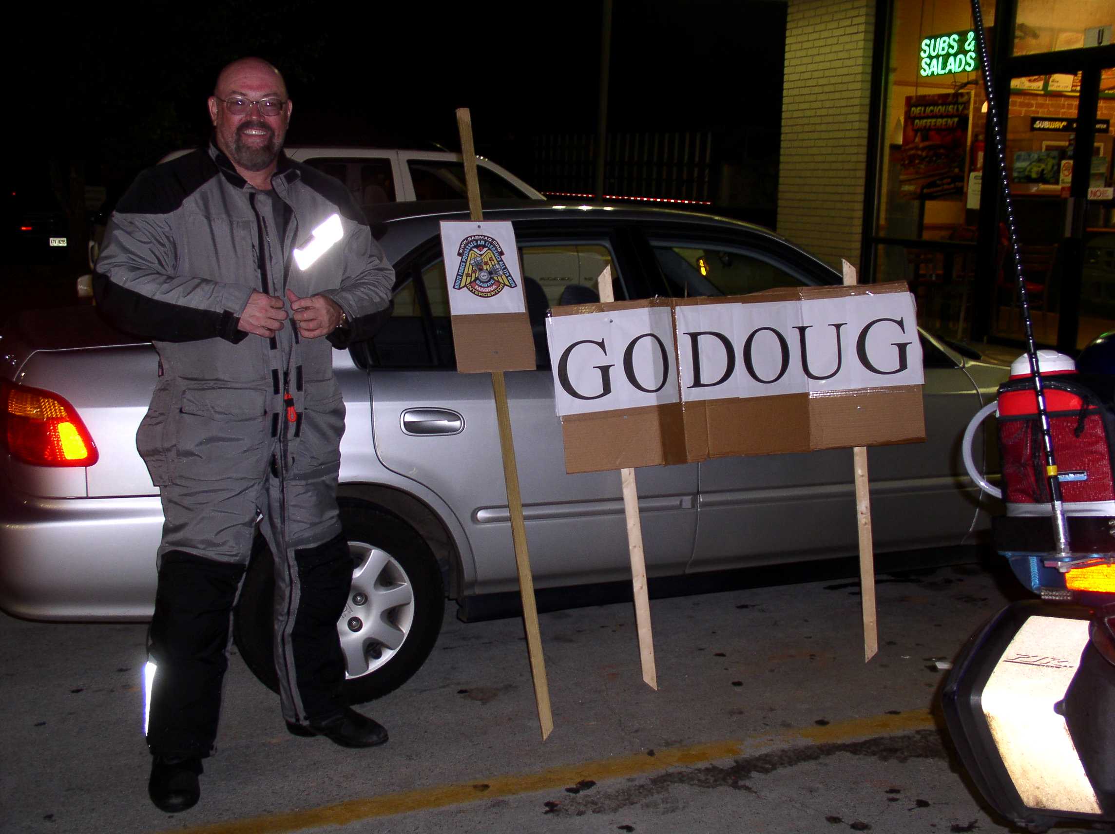 | The Twilight Zone That's what Doug said he thought he was in, when he stopped for fuel in the middle of nowhere, and a car pulled up beside him, and the driver hung a "GO DOUG" sign out of the window. He was so surprised that he spilled fuel and forgot to get his time-stamped receipt. (They had a reprint for him inside) The Signs These are the signs David intended to post on the side of the highway. Checking In Checking in with his wife. Our Friend Jonathan Jonathan was in the Subway where Doug and David ate. An "interesting" person to say the least. Confirming Reservations Doug called his wife to make sure he had reservations at his next rest stop. Jonathan was glued to us by that point. Suiting Up Doug preparing to mount up and ride off, with Jonathan observing everything and asking questions non-stop. Ready To Go Suited up, plugged in, system booted up, ready to roll. On the Way Destination - Robbinsville, North Carolina for some sleep, and an early morning stopover at Fontana Dam for bonus points. |