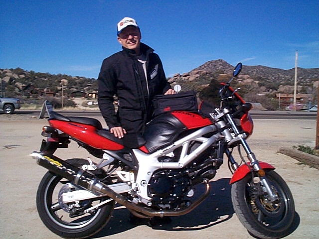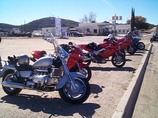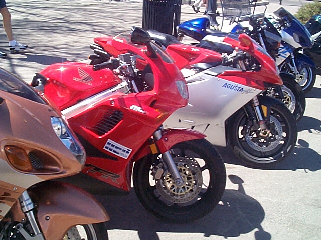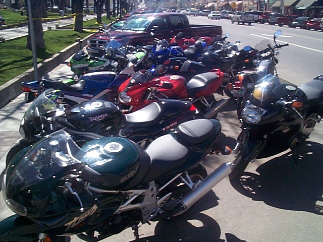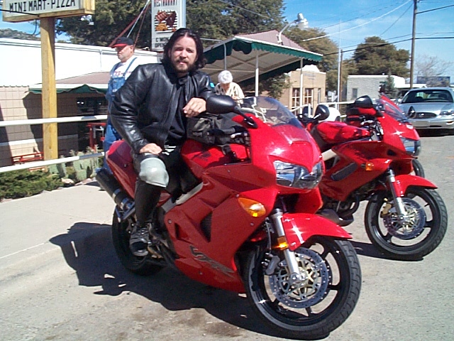 As planned, I met up with my bud Jack at 8:45am in town. He was as ready as I was to tackle the White Spar twisties, and work up a good appetitie. After a good. brisk warmup, we arrived at the Ranch House in Yarnell exactly 5 minutes early, to find Bob Nixon already there with his nice red SV650. We did a bit of bike sniffing, and admired his Two Brothers carbon fiber pipe, which sounded great on the little twin. I was riding my VFR800, and Jack on his VTR1000. Hmmm... no one else here yet, so we'll wait a bit. A group of sport bikes showed up, but none for our group. Let's see... Nice Daytona, CBRXX, TL1000, R1. We chatted a bit, before they roared off for another round of Yarnell goodness. This would be the last time we would see the R1. More on this later. Another group had moved into the lot, and were doing the usual parking lot racing. After it got to be 10 Oclock and no one else had showed, we decided to head down the hill, before tackling breakfast. We ran a nice pace, with minimal traffic. Bob was having a good time keeping up with the VFR on his SV. That little twin looks to be tons of fun. It runs out of top end ooomph, so I could pull away at will, but it was more powerful than expected. And it simply looks to be a twisty road weapon. We got back into town, and pulled into the only other restaurant spotted. Ya gotta love 3 red sportbikes marking their turf, eh? Jack seemed to enjoy his meal, and the subject of jobs came up. Bob tried to explain what he did for a living. After about 10 minutes he gave up. I'm not even sure HE knows!