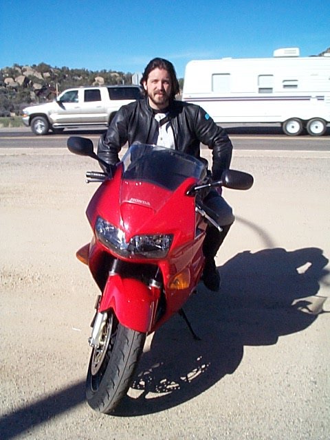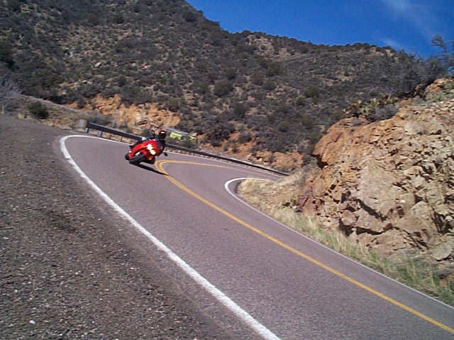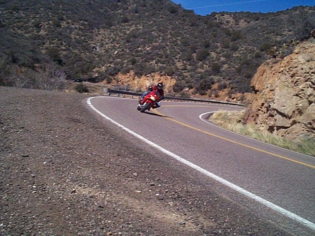 Still no shows, and it was around 11 or so. Hoping no one had gotten hurt. Anyway, we mounted our respective steeds, and fired them up. Two V-Twins, and my V-Four. Good sounds. I led the group towards Prescott at a very sedate pace as we did the straights approaching the twisties. We then got to the base of the mountain. This is what we had been waiting for! 15 miles of pure, unadulterated fun. Clean roads, good surface, and easily disposed of traffic. I had the VFR going back and forth from full lean to full lean. Nearly a sexual experience, it can be! About 5 miles from the top, we came to a dead stop. Fire trucks and cops were tending to something. At first, I thought speed trap, but not with a fire truck. After a minute or two, we were moving along, and passed a group of riders standing there. Wait! These were the guys from this morning, looking none too happy. We proceeded about a mile up the road, and decided that since traffic was heavier due to the roadblock, we would snap a few "action" shots. Here's Bob, Jack and me, doing our best knee dragging! OK, so we only had one try at it.