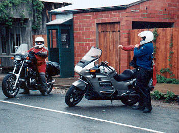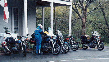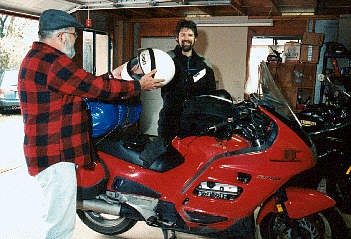 Uncle Milt, stylishly clad in bright red, ready to ryde out on his gorgeous V65 Magna. Truly a shame he had to take that bike out in such weather. Milt wasn't nearly as bad as YWR said he was. ":-) |