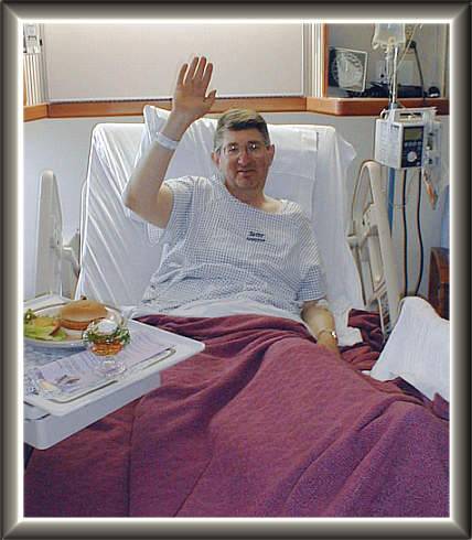 Mark Muelhausen Mark was unfortunately involved in the only incident at this year's Fling. Here he is, layed up in the hospital afterward, his left leg suffering from a compression fracture. Through it all, Mark maintained a positive attitude and a appreciation for all that was good about his long voyage to SMWSF2K. |