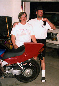 Here's Ron E. astride his new love, or at least his new LUST. Yes, that's Phil just behind with those 'rabbit ears'. He'd spent just a bit too much time in the desert sun this particular day (Sunday, after the races). The VTR was an impressive bike. I fully expect- ed to be uncomfortable after a few miles of the Phoenix metro 'slab', but was pleasantly surprised by Stormy's ride and ergos. When Axel stole the VTR on Sunday morning, I was forced to take Lynn's lovely VFR. Much to my amazement, I wanted Stormy back. Then there were those HOOLIGAN pipes.... |