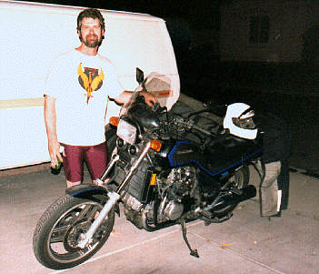 And this is the legendary Phil Ross. The bike here is 'Slut', the V65 Sabre that Axel picked up, stored, then rode down to Phoenix (from San Francisco) for him. Phil is definitely a long- distance guy, and headed back after our weekend in Phoenix to his 'home digs' somewhere back in 'snow country'. This bike, by the way, was purchased for - um - less than a dollar per CC. Quite a bargain - even if it is a Fugly Sabre. |